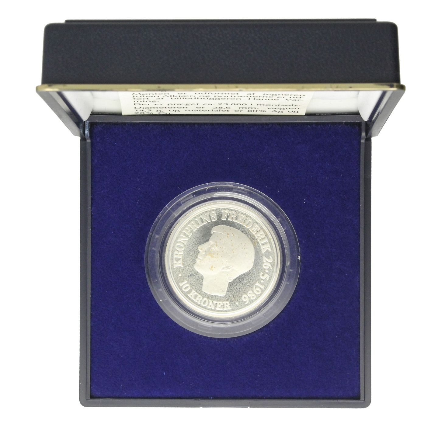 10 kr sølv 1986 i medaljepræg med riflet rand, udstedt til minde om Kronprinsens 18 års fødselsdag. Mønten er udformet af tegneren Johan Alkjær, og portrætterne er udført af billedhuggeren Hanne Varming. Præget i kun 23.649 eksemplarer.