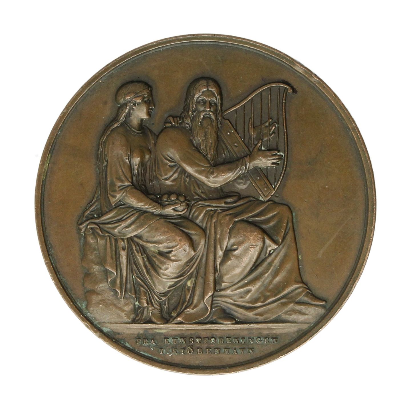 Medaille af bronze, udgivet af "Kunstnerforeningen i Kiöbenhavn", præget til minde om Adam Oehlenschläger af medaillør Conradsen. Ø. 51,5 mm. Vægt: ca. 93 gr.