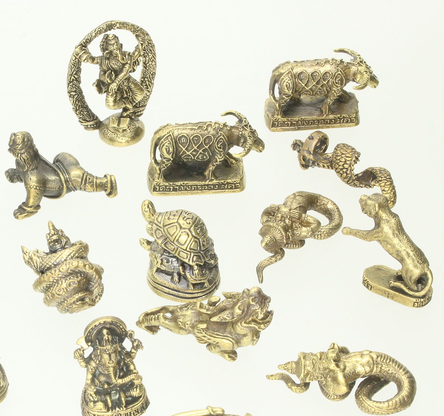 En samling diverse miniature dyr af messing, bl.a. skildpadder, elefanter og slanger. Varierende størrelser.
