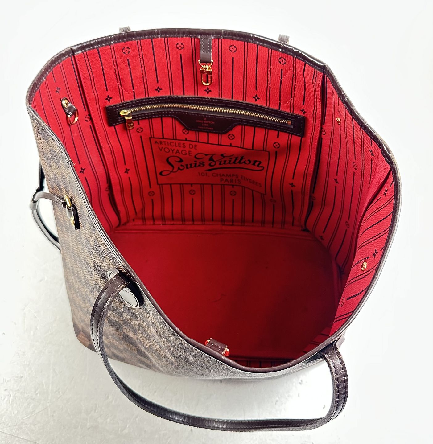 Louis Vuitton - Neverfull tote taske af brunt damier ebene kanvas med mørkebrune læderbesætninger. Gyldent hardware. Indvendigt opdelt i ét stort rum, heraf mindre lynlåslomme.