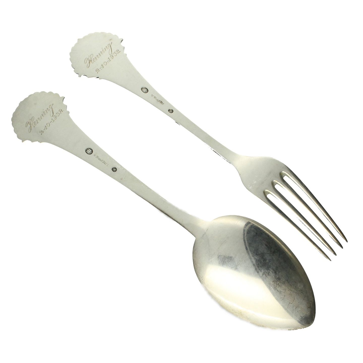 'Slotskirken' gaffel samt ske af sølv. L. ca. 19,5-20 cm. Samlet vægt: ca. 108 gr. Fremstår med indgraveringer.
