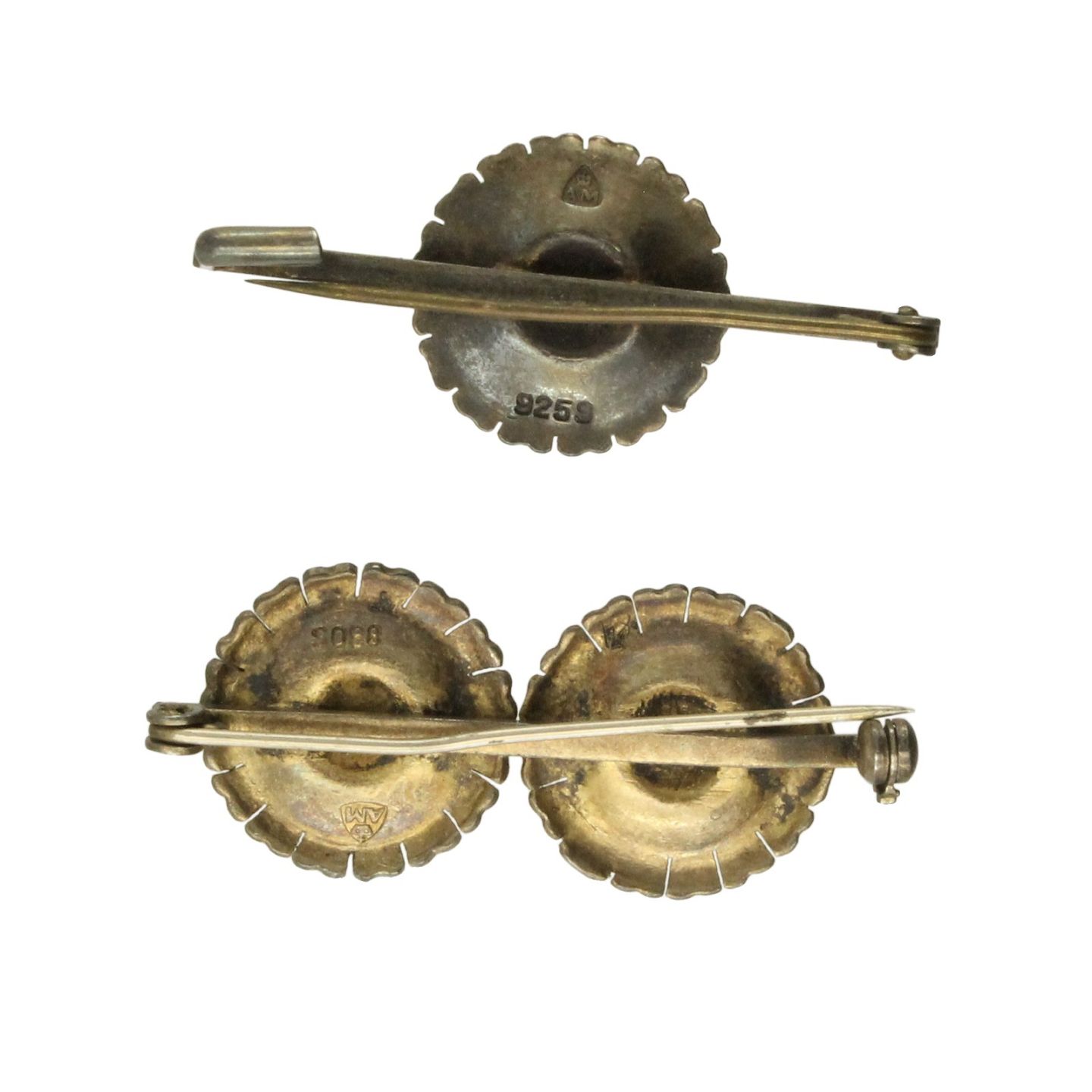 Anton Michelsen - To marguerit brocher udført af sterling sølv / hvid emalje. L. 4 cm. Samlet vægt: ca. 9,6 gr. Fremstår med små skader på emalje.