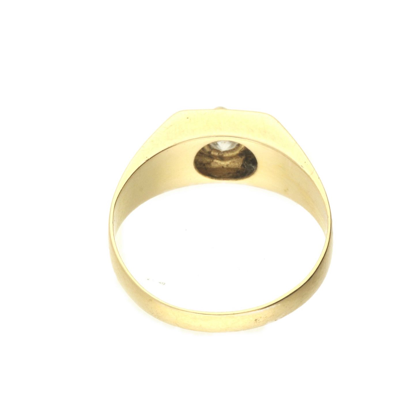 Ring udført af 18 kt. guld fattet med klar sten. Ringstr: 61. Vægt: ca. 4,41 gr.