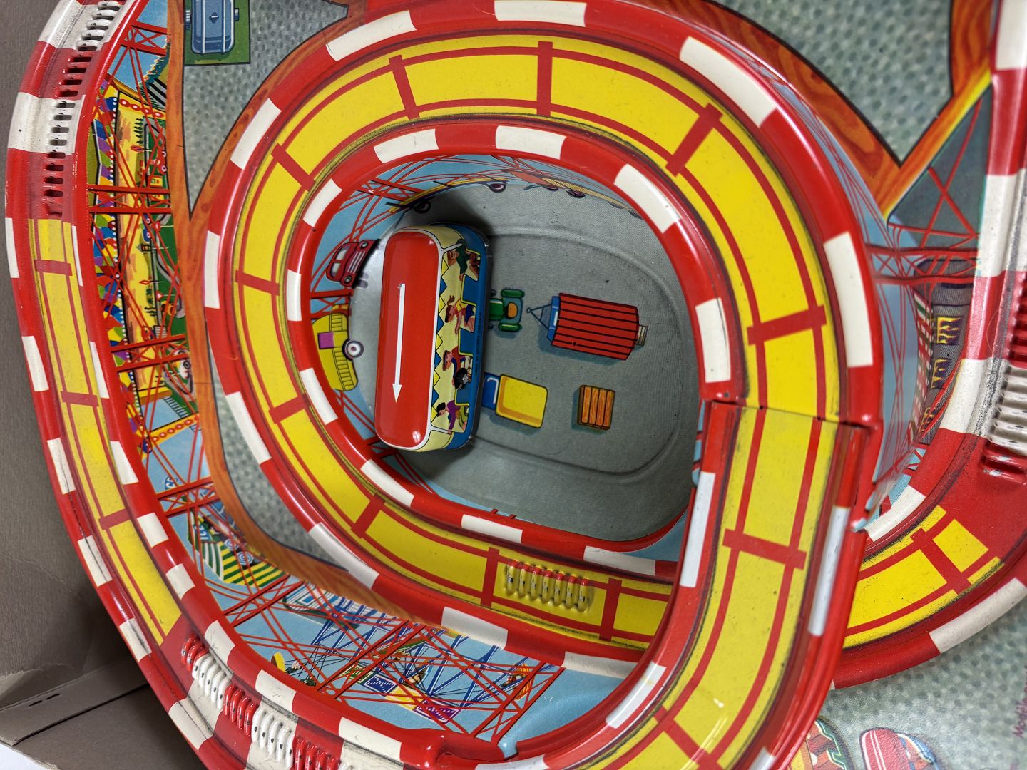 1) En technofix rutchebane, omk 60 år gammel. Selve banen (plastik) er ubeskadiget og begge vogne virker glimrende.