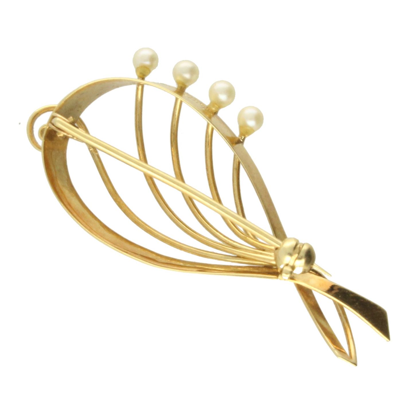Broche af 14 kt. guld fattet med fire perler. L. ca. 4,5 cm. Vægt: ca. 3,78 gr.